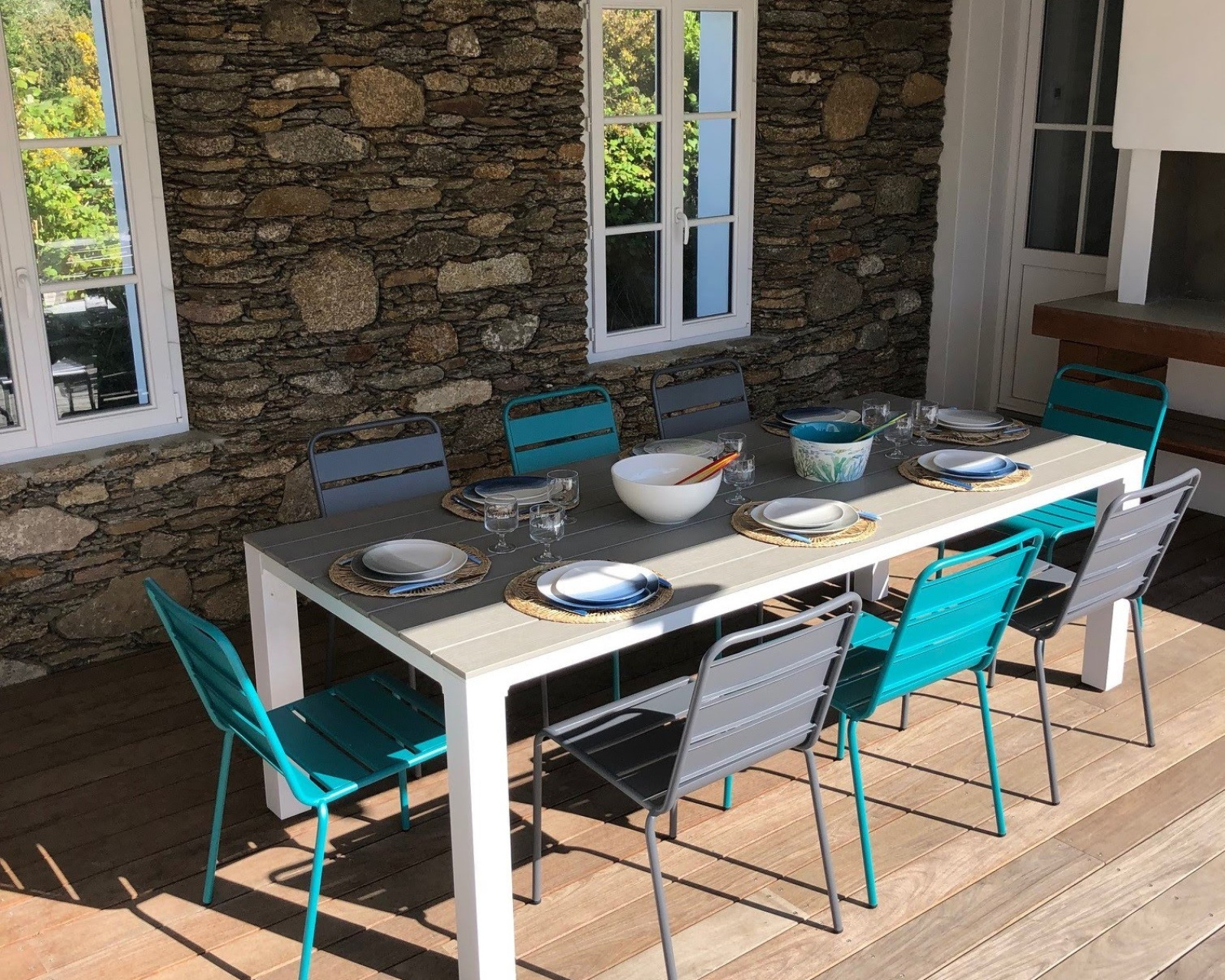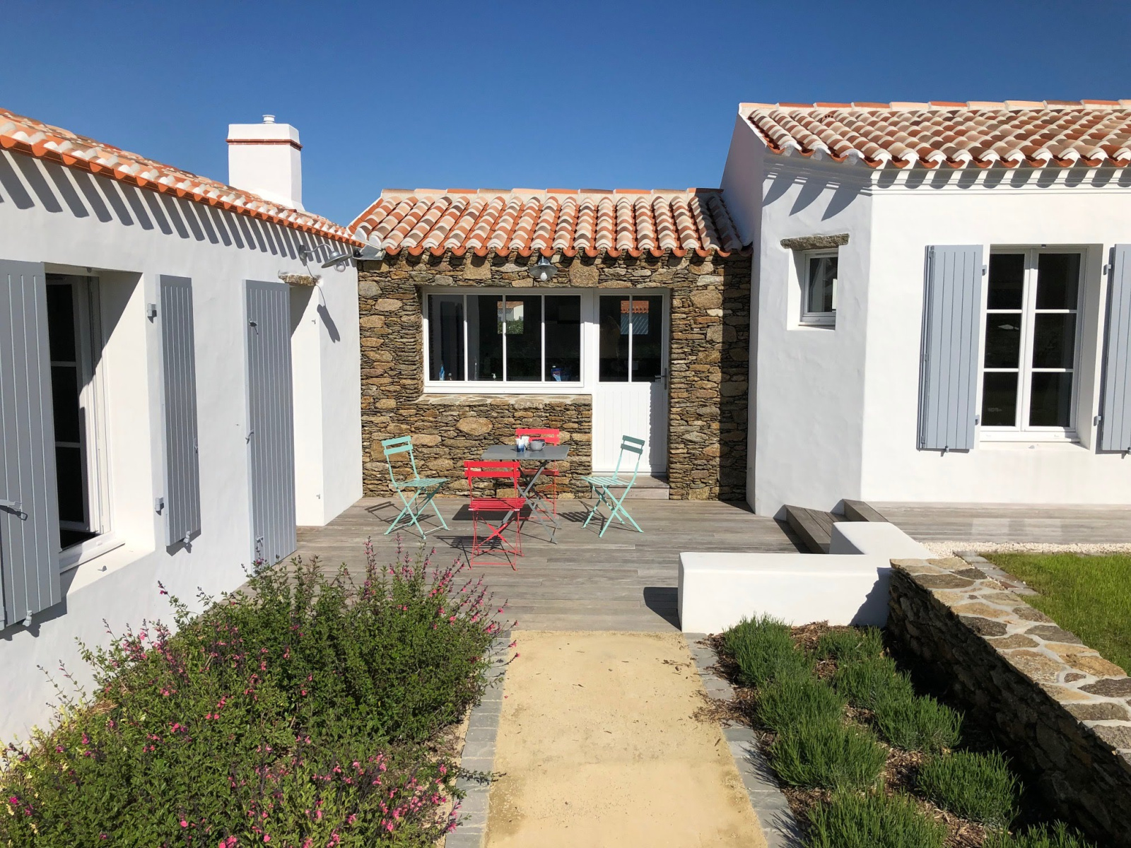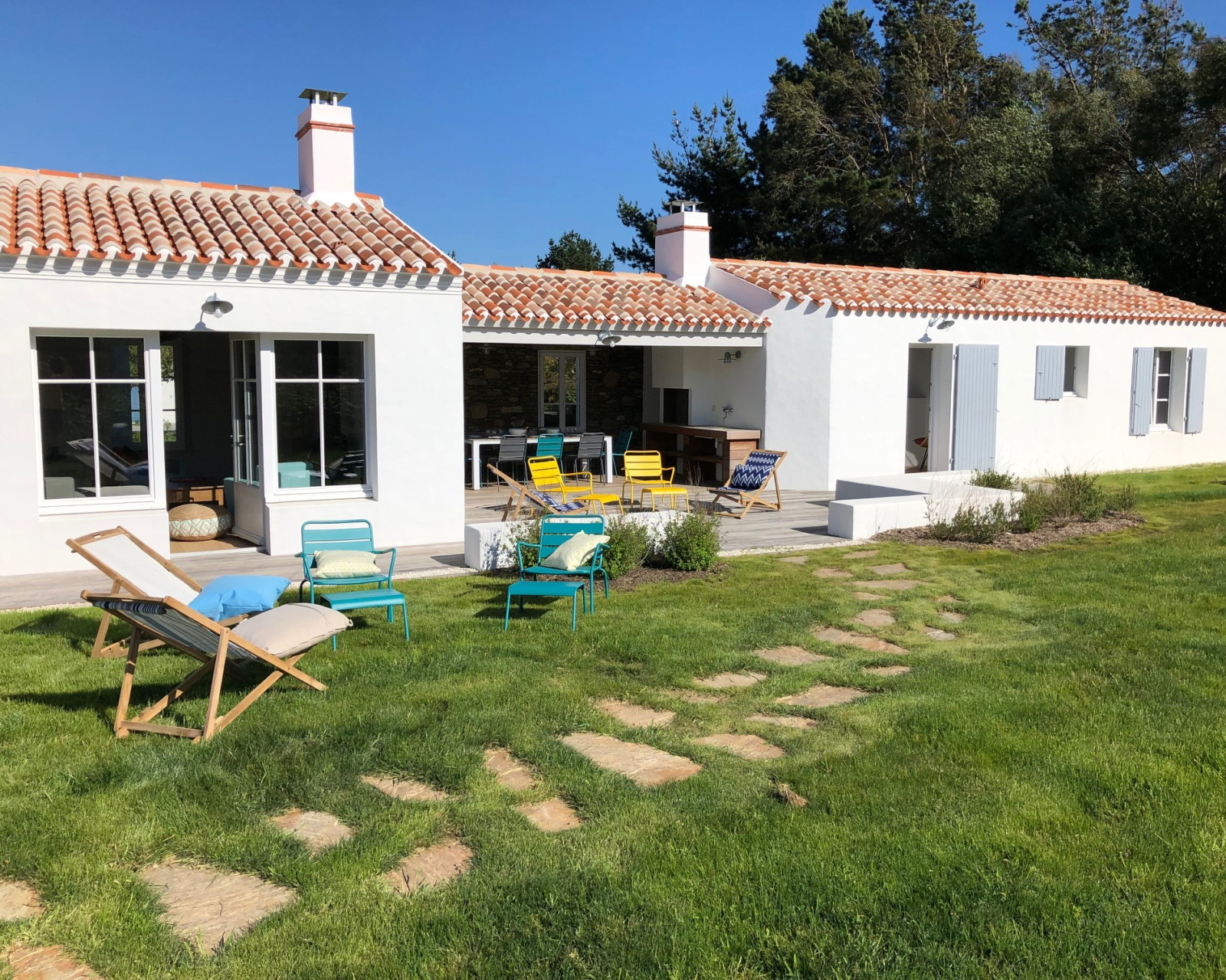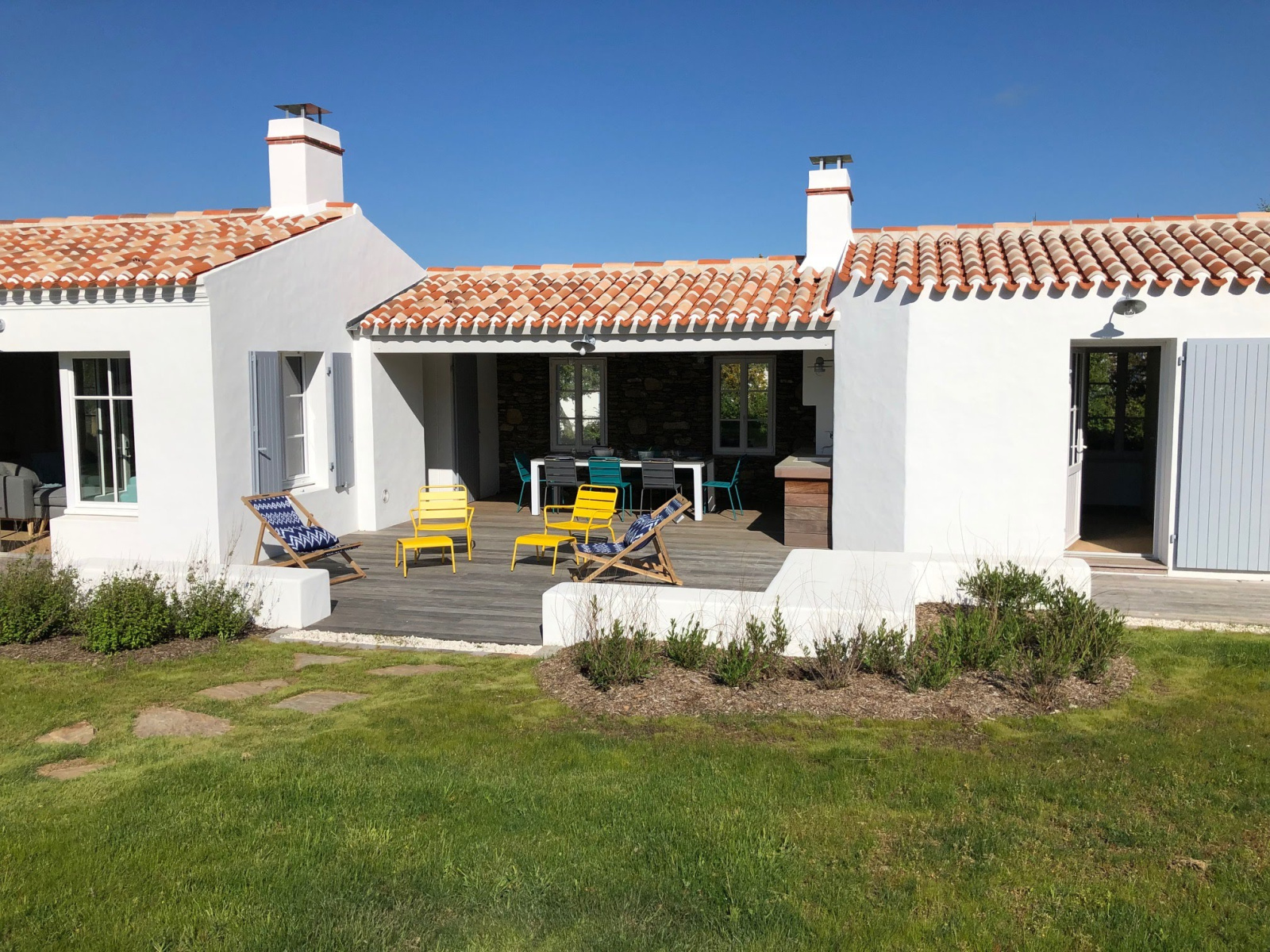 Terrasse en bois, patio, garage, douche extérieure, et grand jardin.