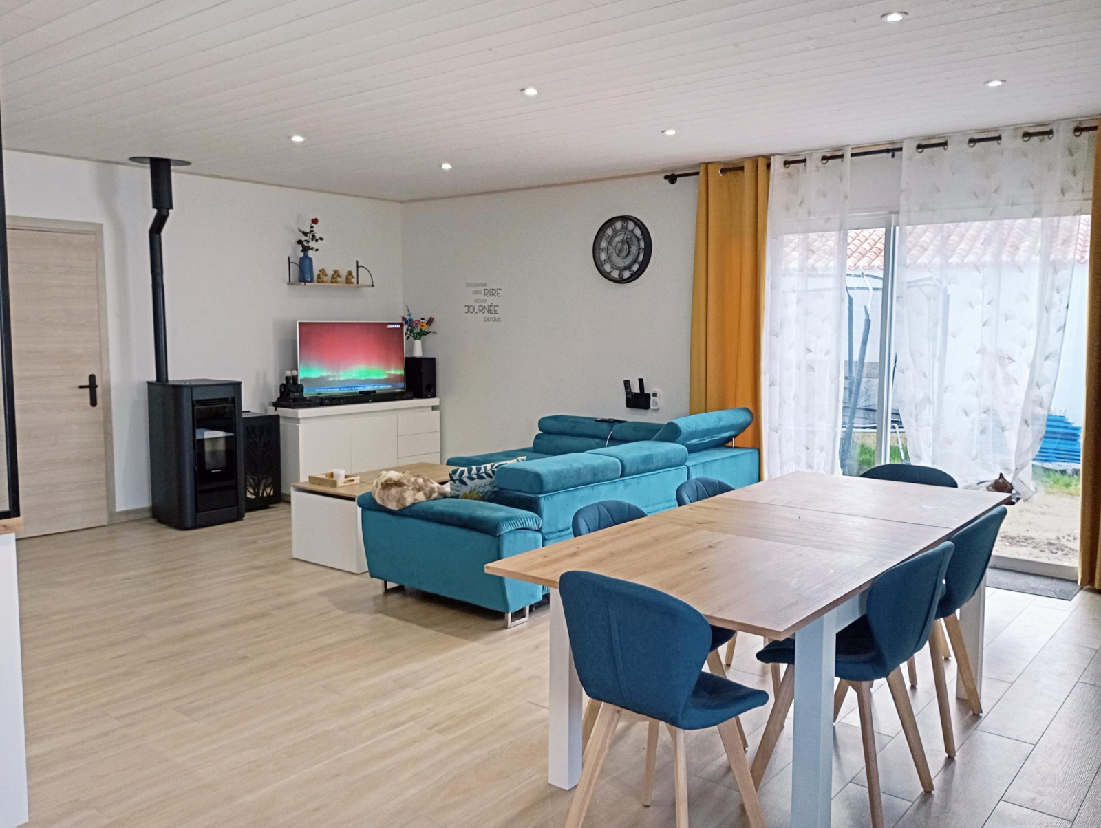 Elle se compose d’une entrée, pièce de vie spacieuse et lumineuse avec cuisine ouverte, buanderie, quatre chambres, salle d’eau et WC.