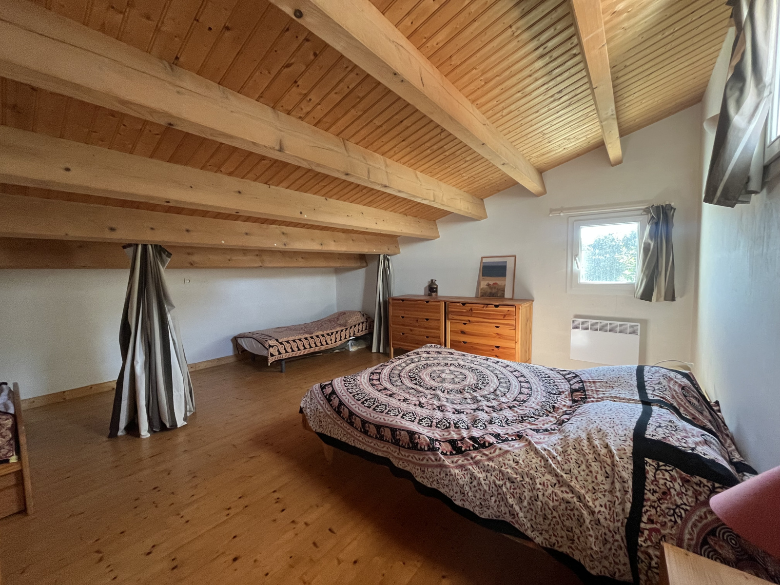 1ère partie avec salon, salle à manger, cuisine ouverte, deux chambres, deux espaces nuit en mezzanine, salle de bain/douche, WC ;