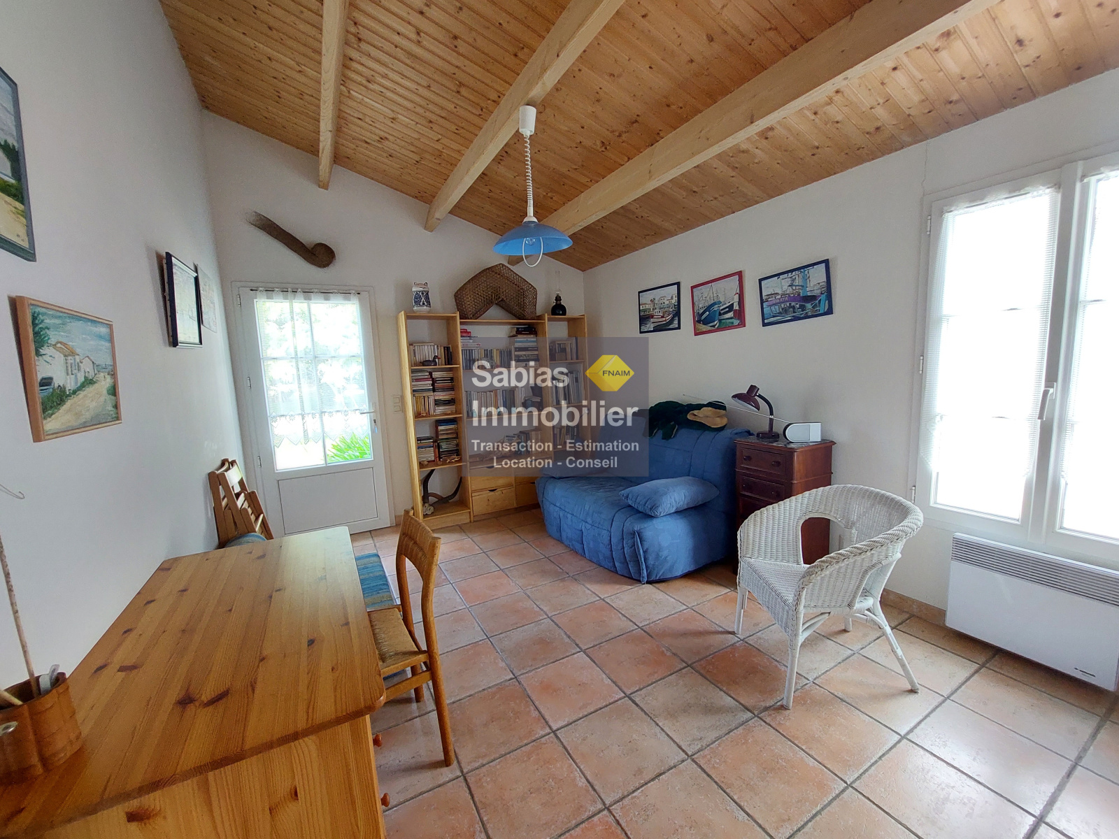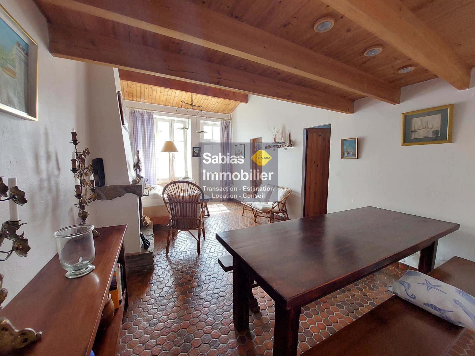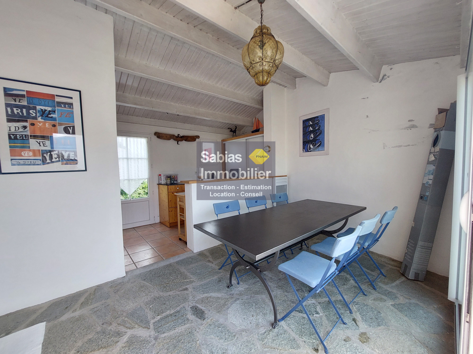 2nde partie : cuisine et salle à manger, 3 chambres, WC/ buanderie, salle d’eau ; patio, garage à vélos, terrasse en pierre.